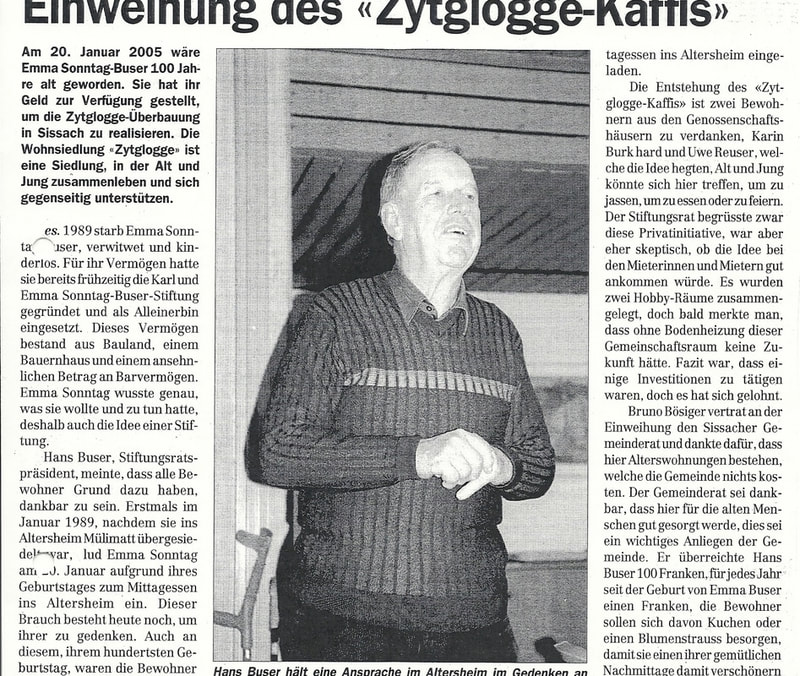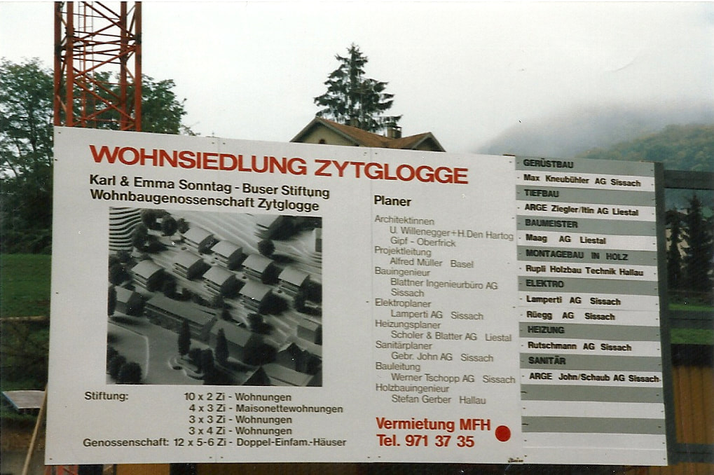 Die Stiftung geht auf das Vermächtnis von Emma Sonntag-Buser zurück und realisierte daraus eine generationenübergreifende Wohnsiedlung mit Alterswohnungen und Familienhäusern am Zytglogge-Hang.